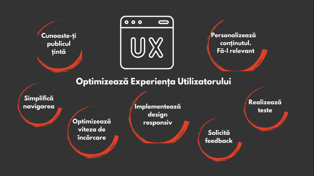 Mai jos am punctat câteva elemente importante ce fac parte din strategii generale de optimizarea a experienței utilizatorului (UX). Acestea constituie o bază de pornire pentru cei care doresc să își optimizeze website-ul sub acest aspect.